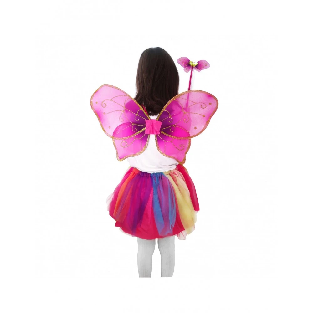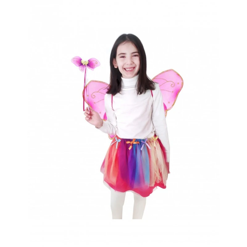 Mehrfarbiges Kinderfeen-Set bestehend aus Tutu, Flügeln und Zauberstab. Es ist ein perfektes Set für den Karneval oder jede Kinderkostümparty.
