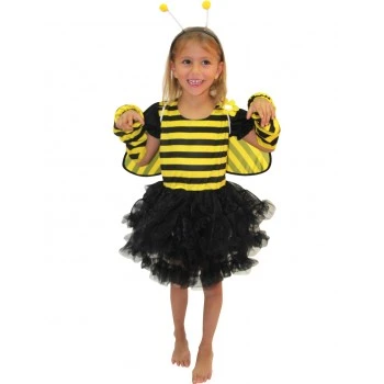 Hummelkostüm, für Mädchen von 5 bis 6 Jahren, enthält ein Kleid mit Trägern. Der obere Teil ist gelb-schwarz gestreift und hat eine Blume auf der Brust. Der Rock ist schwarz mit gelbem Saum. Außerdem enthält das Kostüm gelbe Flügelchen, Handschuhe und Fühler.