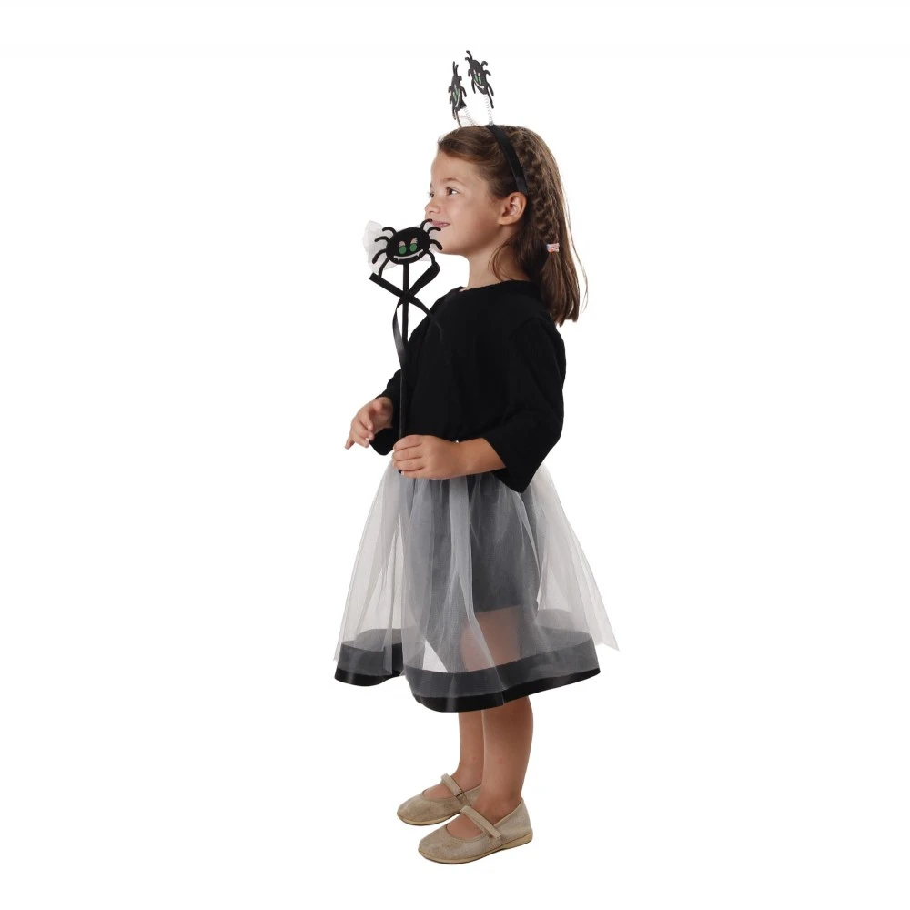 Wenn sich dein Kind an diesem Halloween in eine böse Hexe verwandeln will, solltest du keine Zeit mit der Suche nach dem Zubehör verschwenden und dieses Set kaufen! Es besteht aus einem schwarzen Tüllrock, einem Zauberstab mit einer Spinne am Ende und einem Haarreif mit zwei süßen kleinen Spinnen.